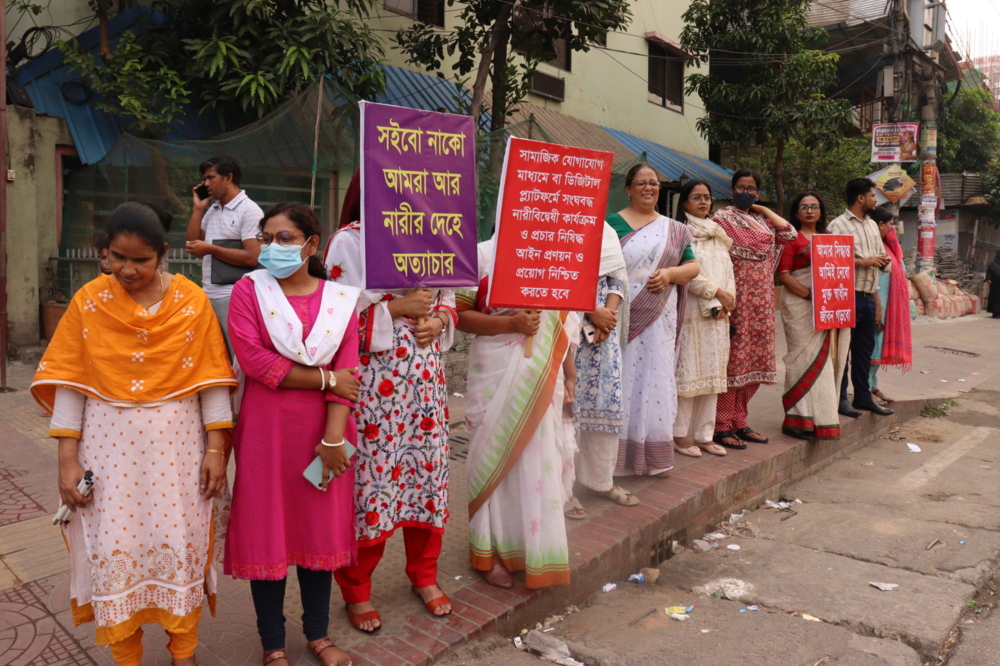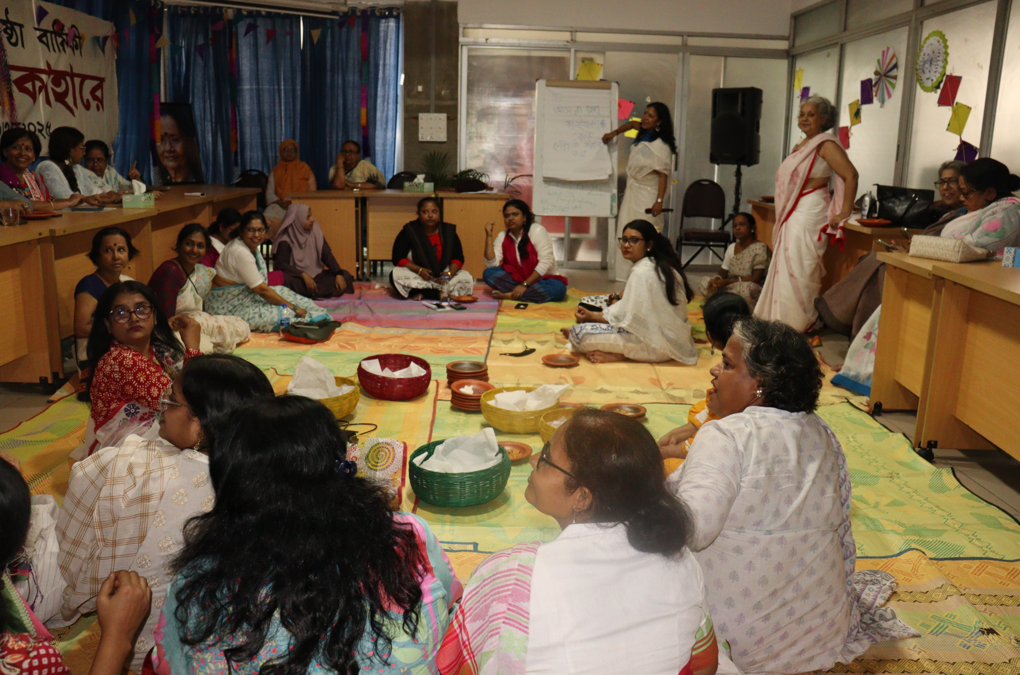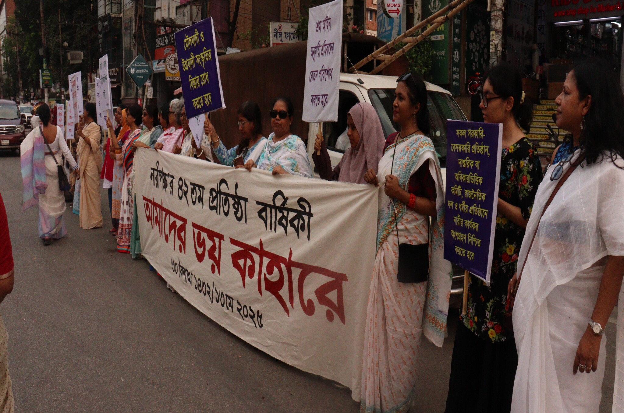 নারীপক্ষ’র ৪২তম প্রতিষ্ঠা বার্ষিকী ৩০ বৈশাখ ১৪৩২/১৩ মে ২০২৫ বিকাল ৪টায় প্রতিবাদী অবস্থান – প্রতিবাদে প্রতিরোধে ‘আমাদের ভয় কাহারে’ প্রস্তাবিত ব্যানার নিয়ে ও ফেস্টুন নিয়ে নারীপক্ষ কার্যালয়ের সামনে অবস্থান কর্মসূচি করা হয়। বিকাল ৫টায় মুক্ত চিন্তার আসর/ আলোচনার মাধ্যমে শ্লোগান তৈরি করা, প্রতিবাদের গান কবিতা আবৃত্তি করা হয়।